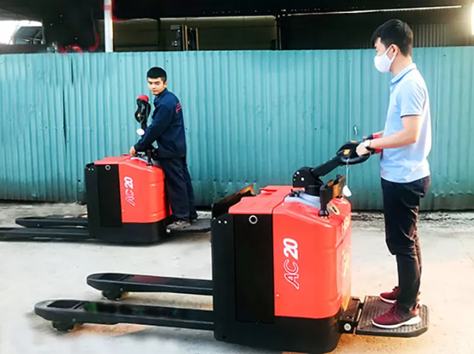 Xe nâng tay điện dắt lái là dùng tay điều khiển các phím chức năng trên tay cầm( tiến/lùi/ nâng/ hạ hoặc bấm còi), người điều khiển đi bộ theo để điều khiển xe di chuyển hàng hóa.