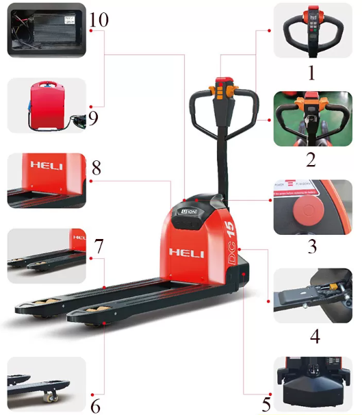 Các bộ phận chính cấu thành nên xe nâng tay điện 2 tấn bao gồm 10 bộ phận cơ bản sau.